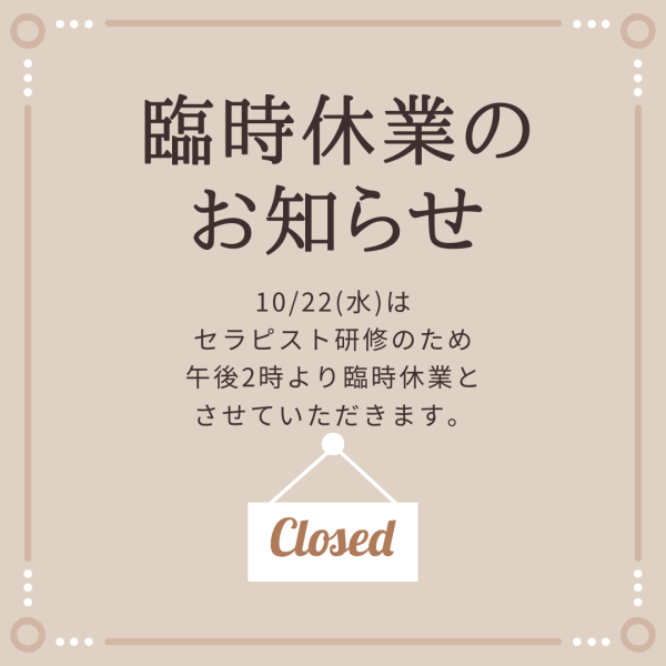 10月22日(水)はセラピスト研修のため、午後2時より臨時休業とさせていただきます。